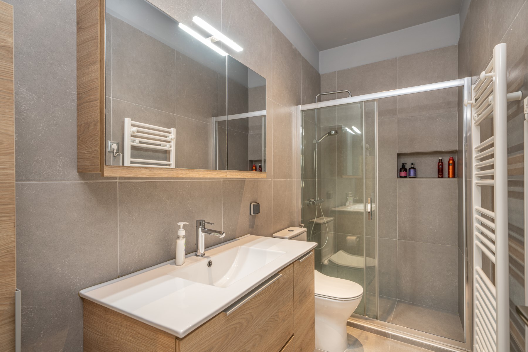 From the moment you step inside, you’ll feel at ease. The open-plan layout includes a fully equipped kitchen where you can prepare your favorite meals, and a cozy living area with a plush sofa. Whether you're streaming a movie, enjoying your favorite tunes on the high-quality SONOS soundbar or JBL Bluetooth speaker, or catching up on emails at the clever built-in workspace (complete with a PC screen), every detail is designed for comfort and convenience.